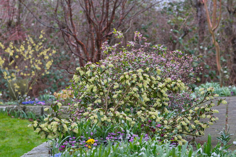 - Daphne bholua 'Jacqueline Postill', Edgeworthia chrysantha, Galanthus, Ribes laurifolium