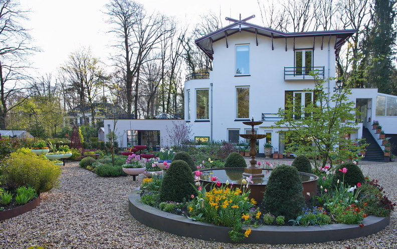 Brunnen, Kegel, Taxus, Tulpen, Kies