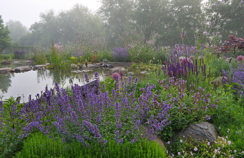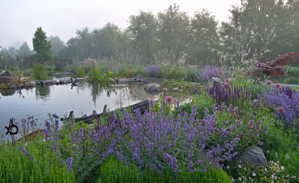 - Baumstamm, Findlinge, Hechtkraut, Knautia, Knautia macedonia 'Mars Midget', Nepeta 'Walker’s Low', Pontederia cordata, Salvia nemorosa 'Caradonna', Teich