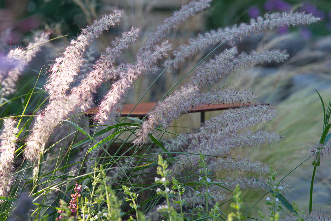 - Kies, Pennisetum orientale 'Karley Rose', Präriegarten