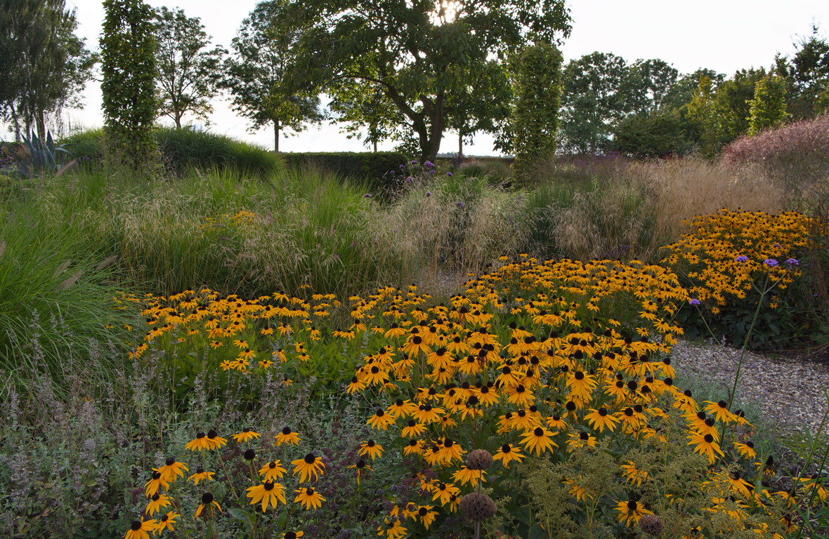 - Deschampsia, Miscanthus, Panicum virgatum 'Heavy Metal', Rudbeckia fulgida 'Goldsturm', Samenstand