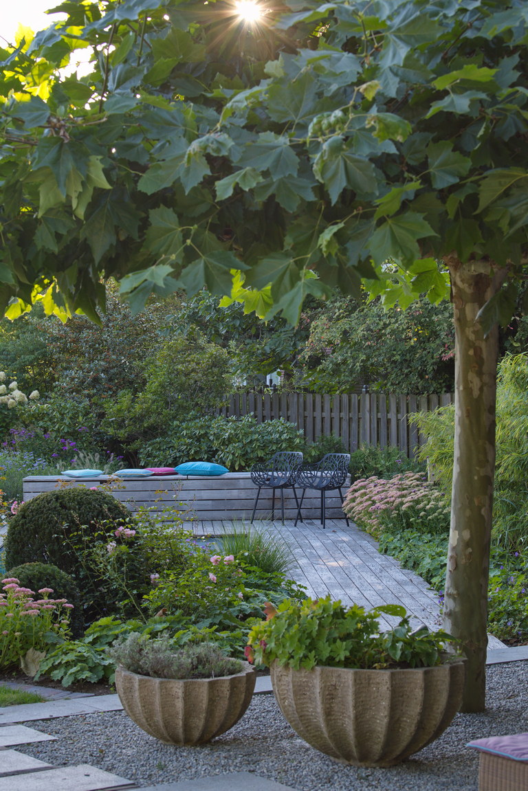 - Dachspalier, Einfassung, Holzdeck, Kissentruhe, Kübel, Minipool, Platane