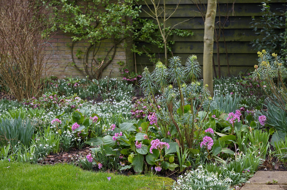 - Galanthus nivalis, Schneeglöckchen, Bergenia cordifolia