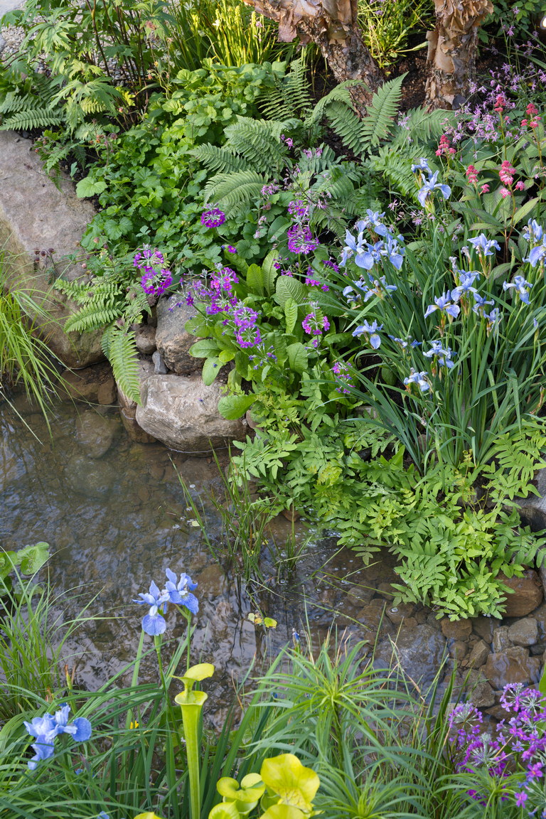 - Bach, Iris sibirica 'Sparkling Rose', Lychnis flos-cuculi, Naturgarten
