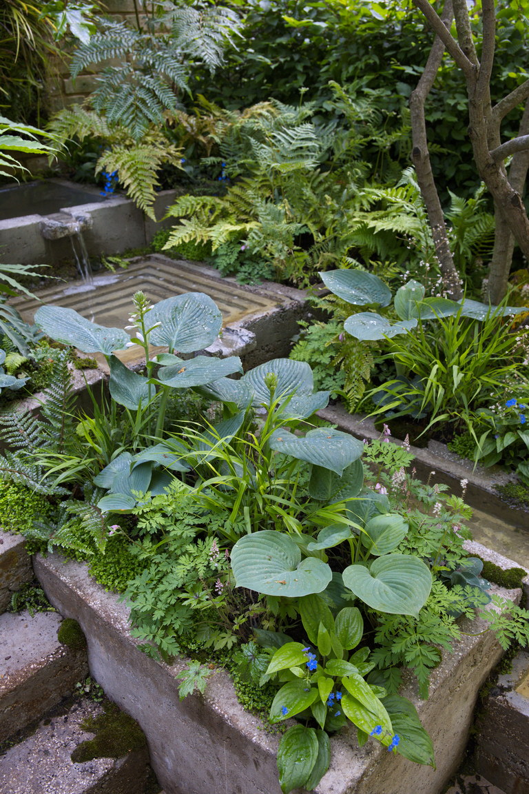 - Hosta, Schatten, Tiarella 'Spring Symphony', Wasserbecken, kleiner Garten, recycling, Brunnera macrophylla