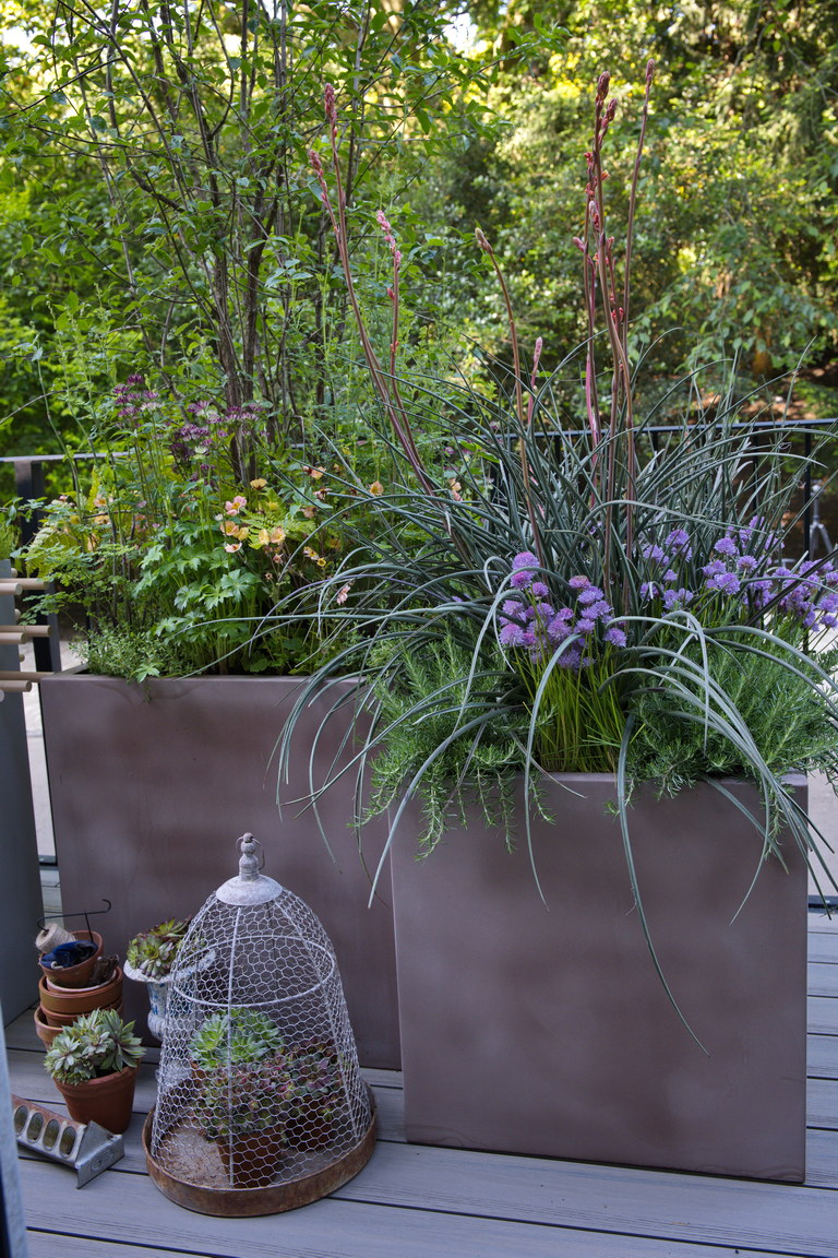 - Allium schoenoprassum, Hesperaloe parviflora, Kübel, Topfgarten