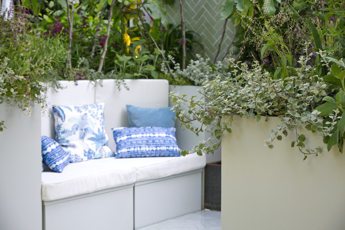 - Aloysia triphylla, blau, Erigeron ‘Profusion’, Helichrysum petiolare, kleiner Garten, silber, Sitzplatz, weiss