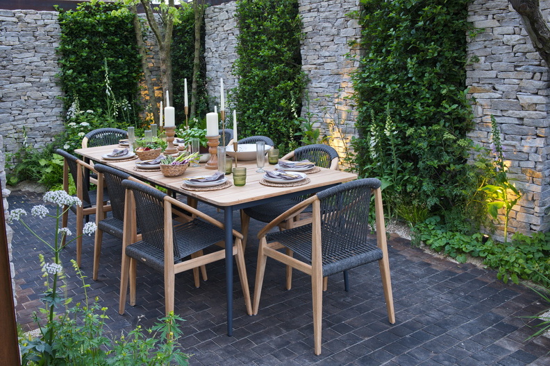 - Acer campestre, Digitalis purpurea, gedeckter Tisch, Klinker, Osmunda regalis, Pergola, Polystichum tsus-simense, Prunus lucitanica, Sandstein, Sitzplatz, Terrasse