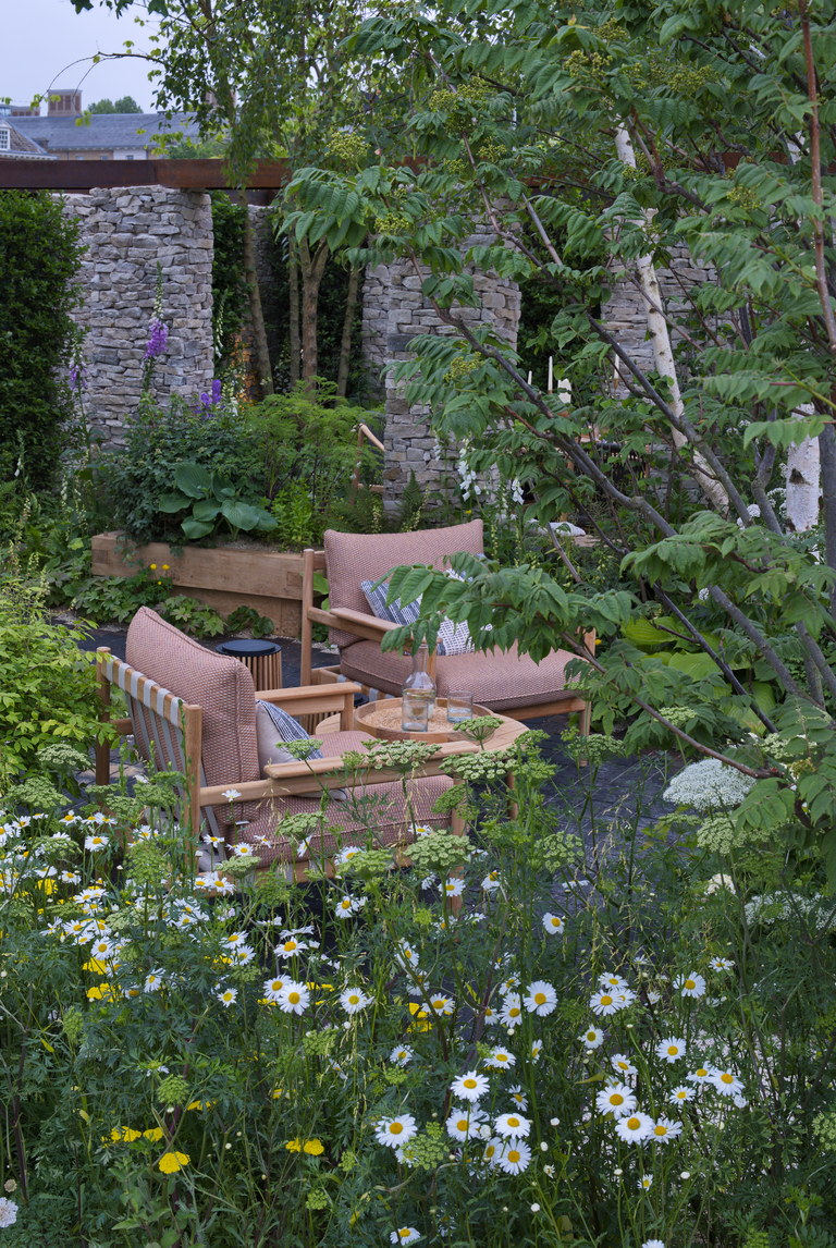 - Achillea filipendulina 'Coronation Gold', Betula pendula, Cenolophium denodatum, Cortenstahl, Naturstein, Sandstein, Sitzplatz, Margerite