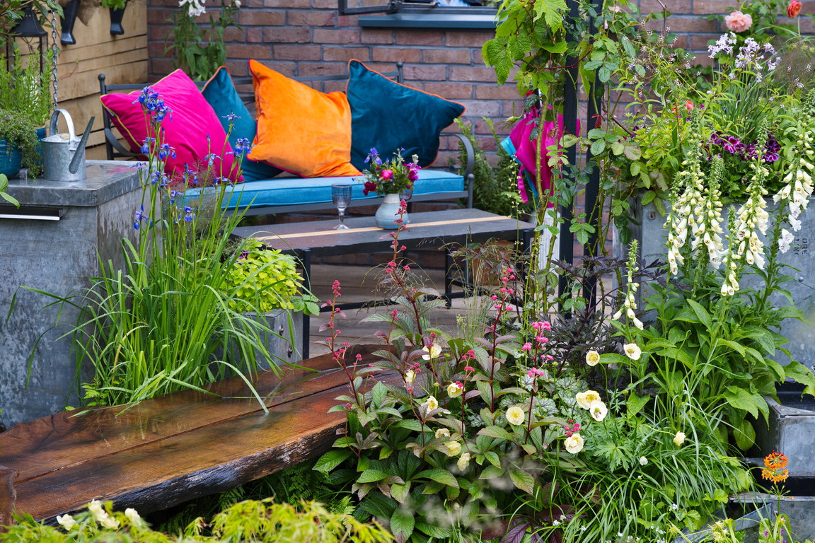 - bunt, Digitalis, Iris sibirica, Rodgersia, Sitzplatz