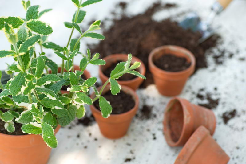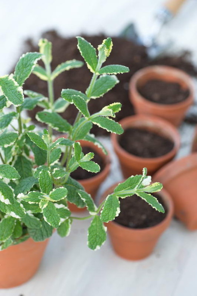 - Gartenarbeit, Stecklinge, Tontopf, Ananas-Minze