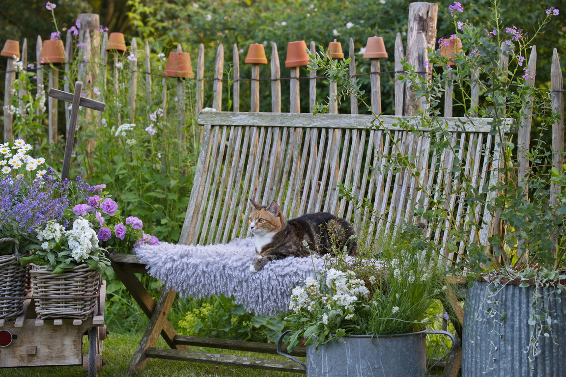 Bank, Katze, Kübel, Zink, Cottage, Bauerngarten