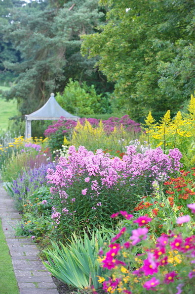 - Campanula lactiflora, Geranium, Philadelphus, Rabatte, Rote Lichtnelke, Silene dioica