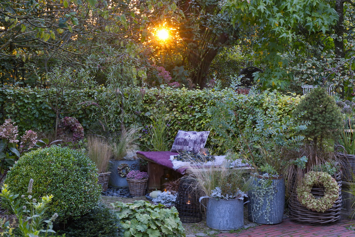 - Bank, Carex buchananii, Eucalyptus, Fagus sylvatica, Gräser, Hecke Feldahorn, Hortensienblüten, Kranz, Kübel, Picea glauca 'Conica', Pyrus salicifolia, Stipa tenuissima, Terrasse, Zink, Zuckerhutfichte