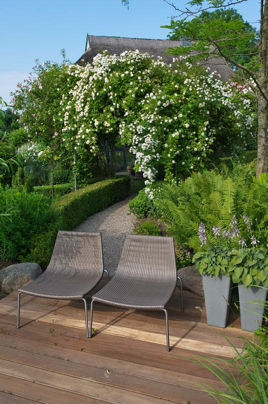 - Garten Fenna Graf, Gartenstühle, Holz, Hosta, Kübel, Paar, Rosenbogen, Terrasse