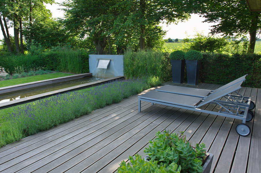 Holzdeck, Liege, modern, Schatten, Terrasse, Wasserbecken