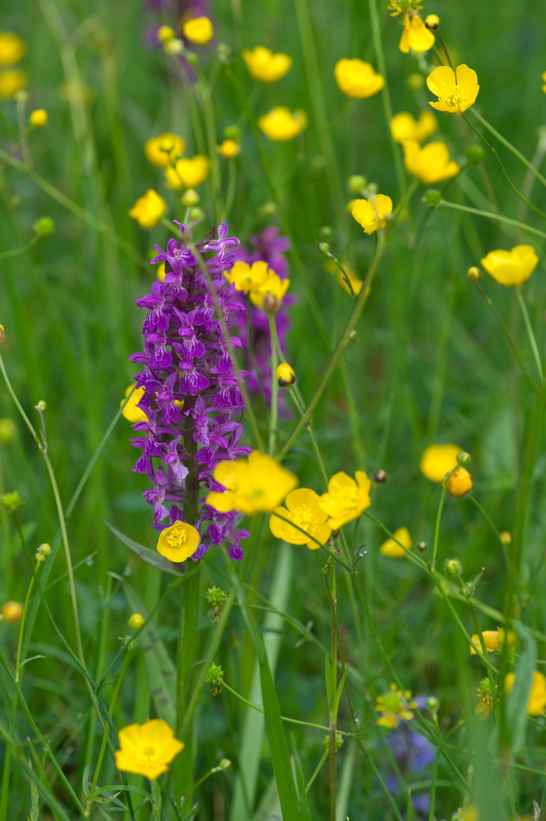 - Dactylorhiza majalis, Feuchtwiese, Ranunculus acris, Sumpfdotterblume