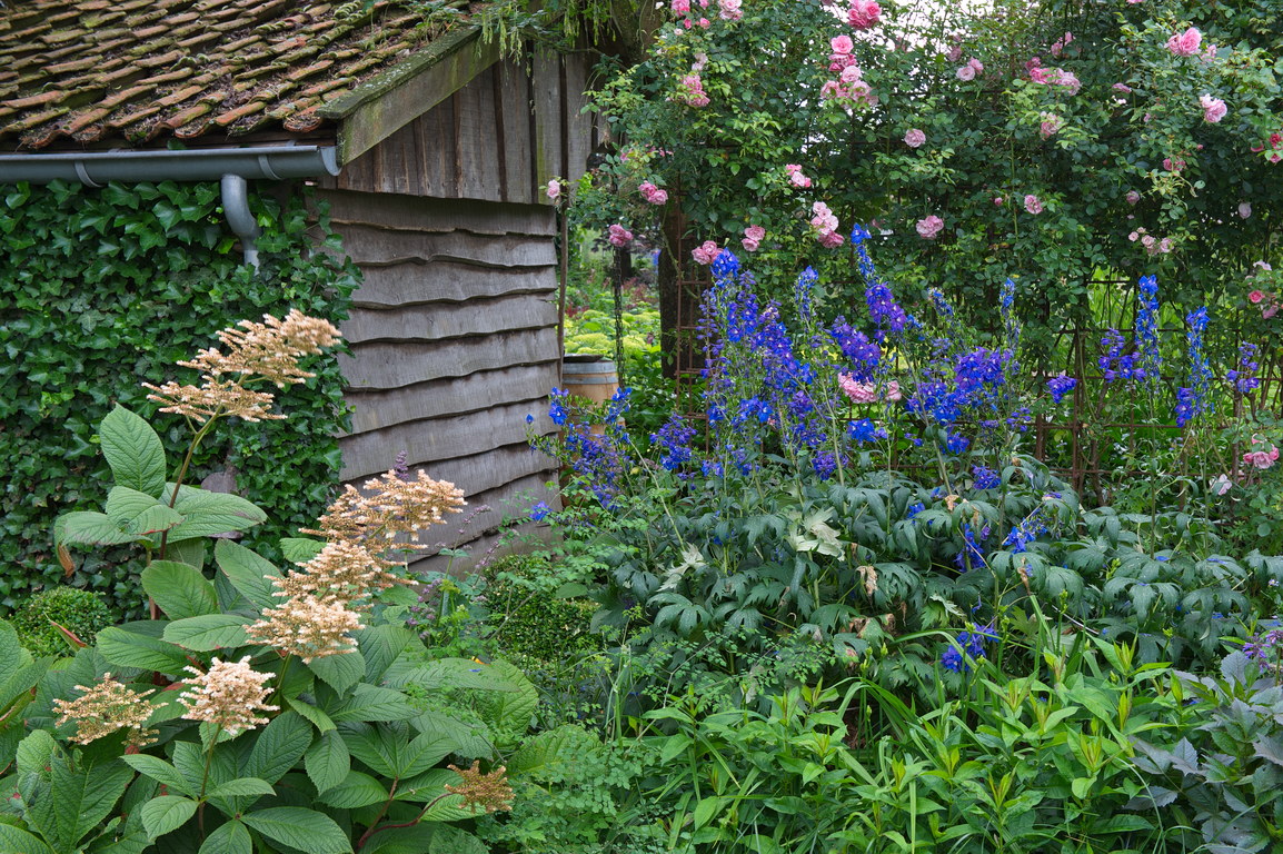 Beet, Delphinium, Filipendula, Kletterrose, Hedera