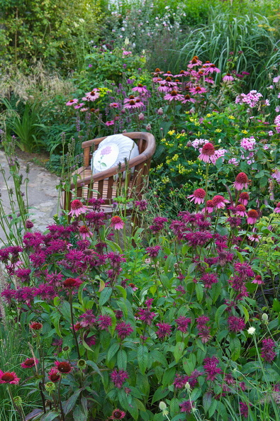 Bank, Beet, Natursteinpflaster, Pfad, Monarda 'Purple Ann', Echinacea 'Magnus'