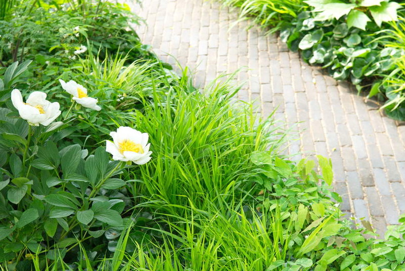 - Paeonia lactiflora "Jan van Leeuwen", u. "White Wings", Epimedium x rubrum, Asarum europaeum, Dryopteris , Rodgersia pinnata, Epimedium x youngianum "Niveum", Deschampsia cespitosa