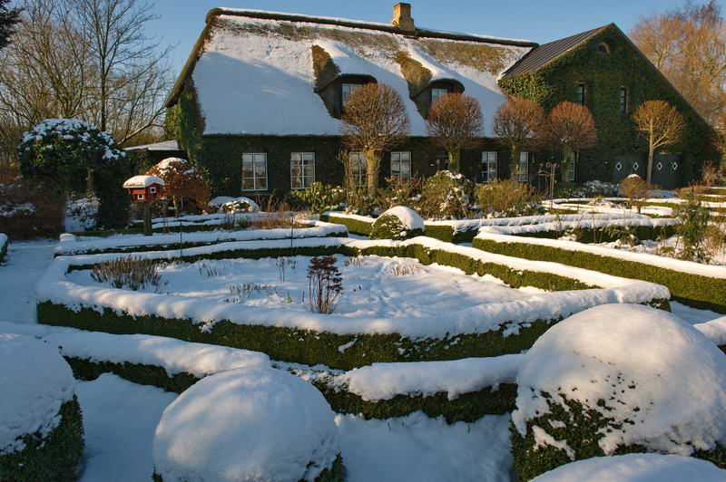 Buchsbaum, Kugel, Schnee, Hecken, Haus, Reetdach
