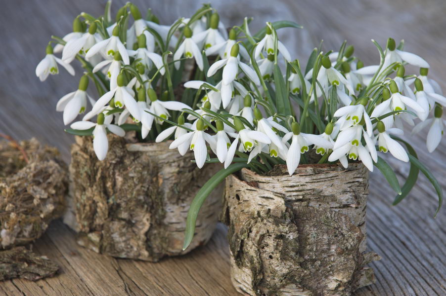 - Brirkenrinde, DIY, Galanthus nivalis, Rindentopf, Schneeglöckchen, Strauß