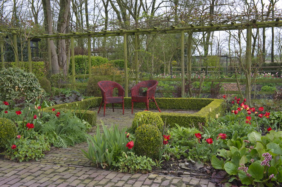 - Gartenstühle, rot, Garten Joke und Henk Cijsouw, Tuin t`Hofje