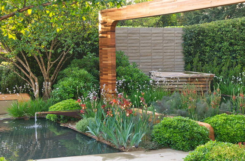 Arbutus, Iris, Libertia grandiflora, Wasser