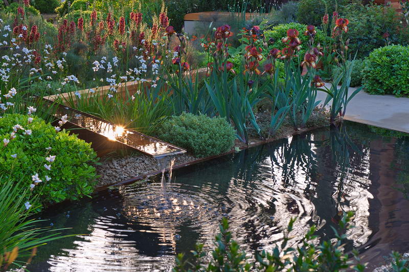 - Chelsea Flower Show 2012, Iris, Libertia grandiflora, Sonnenaufgang, Teich, Verbascum 'Petra', Wasser
