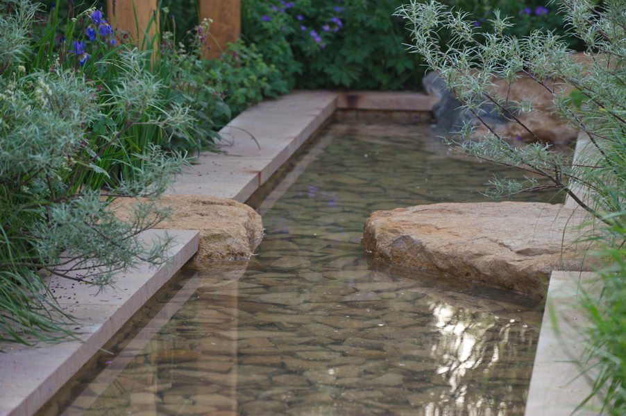 - längliches Wasserbecken aus Sandstein mit Schotterbett