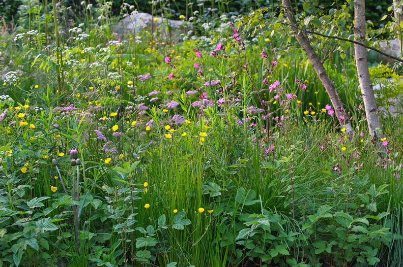 - Naturgarten, Ranunculs acris, Silene dioica, Valeriana officinalis