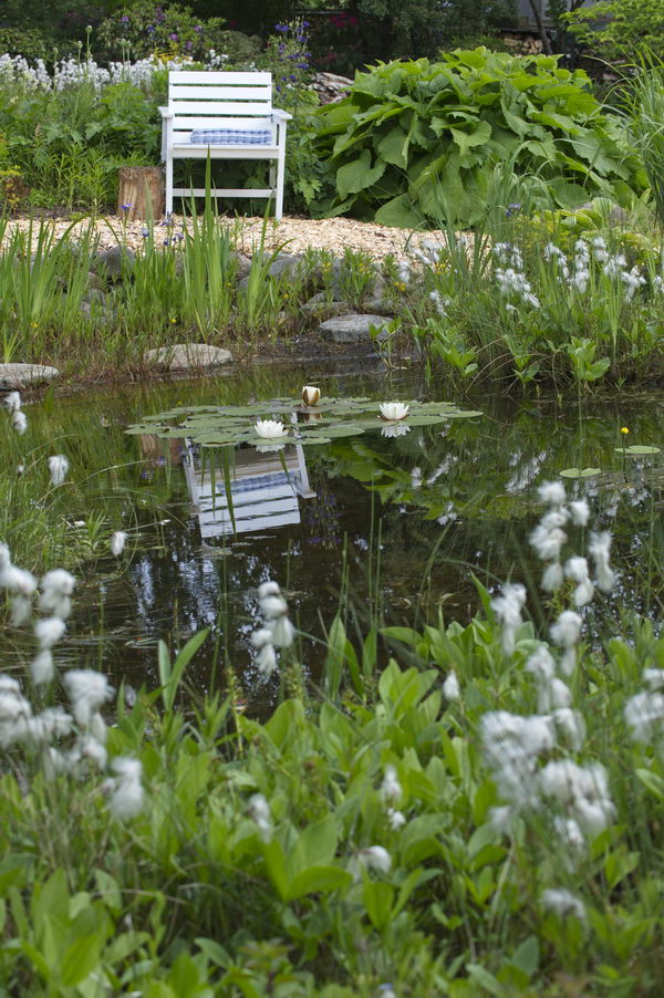 - Garten Sybille Marohn, Gartenstuhl, Spiegelung, Teich, Wasser, Wollgras