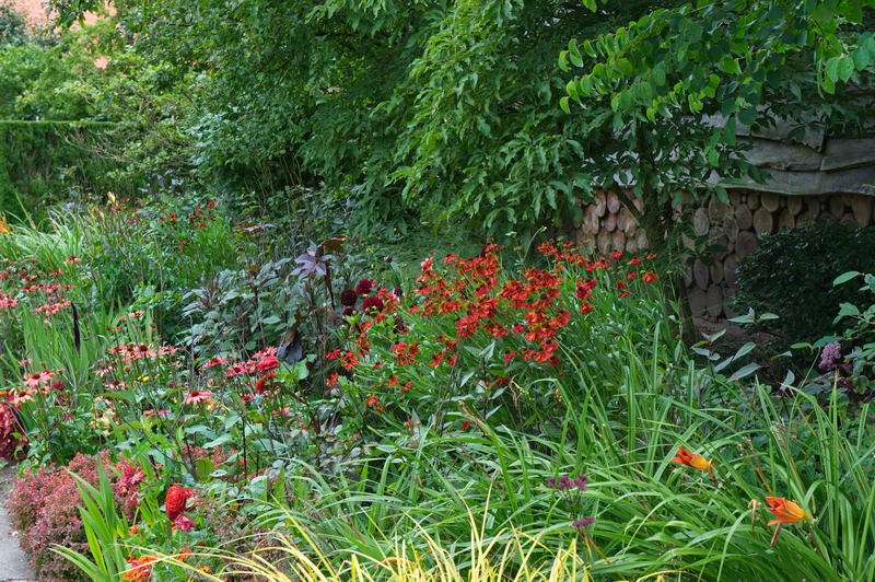 - Bauerngarten, Beet, Echinacea, Helenium, rot, Tuin De Boschhoeve