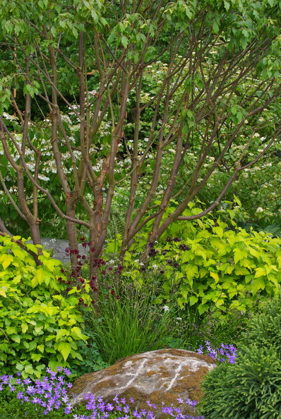 - Cosmea, Delphinium, Findling, Holz, Naturgarten, Verbascum, Totholz