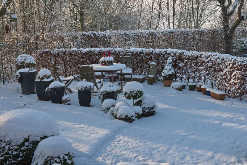 Schnee, Terrasse, Hecke