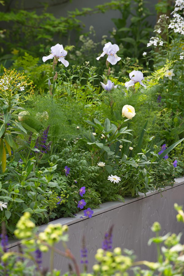 - Geranium, Iris, Leucanthemum vulgare, Päonie, Hochbeet