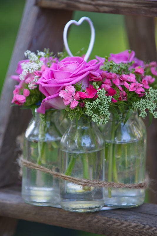 Glasvasen mit lila Blüten auf einer Stehleiter