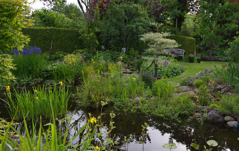 - Bank, Cornus alternifolia "Argentea", Schwengelpumpe, Teich, Brenning