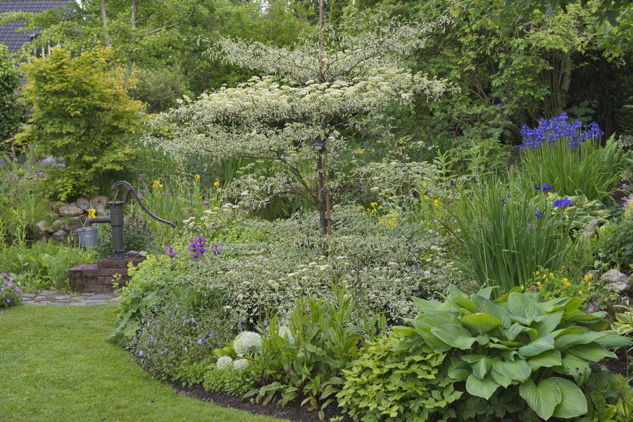 - Cornus alternifolia "Argentea", Farne, Hosta, Iris
