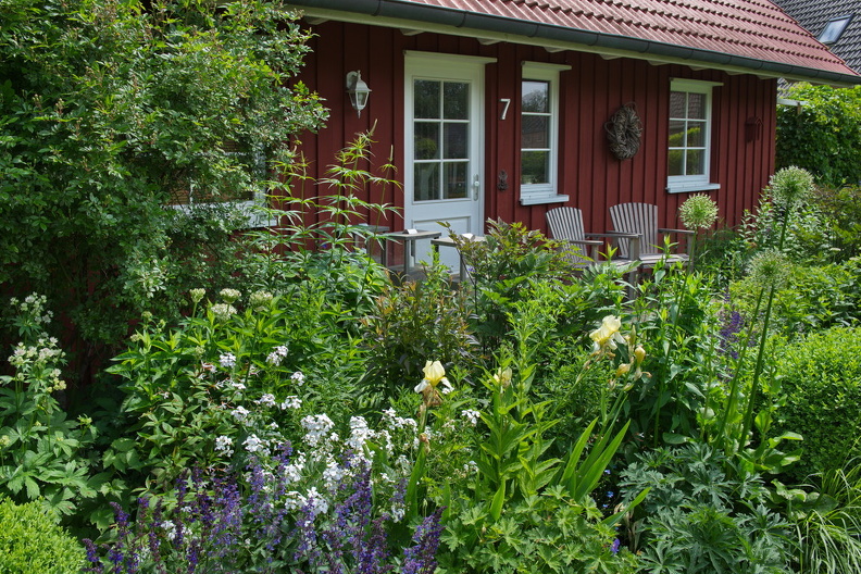 Allium 'Globemaster', Anthemis tinctoria 'Sauce Hollandaise', Pforte, Alchemilla