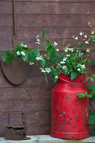 - Milchkanne, Bank, Spaten, Holzwand