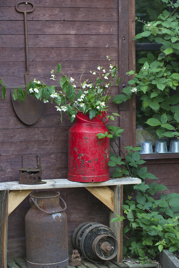 - Bank, Holzwand, Milchkanne, Spaten