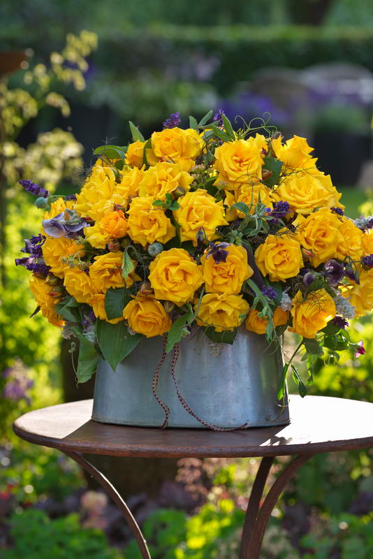 - Gelber Strauß aus Rosen in einer Vase aus Zinkeblech