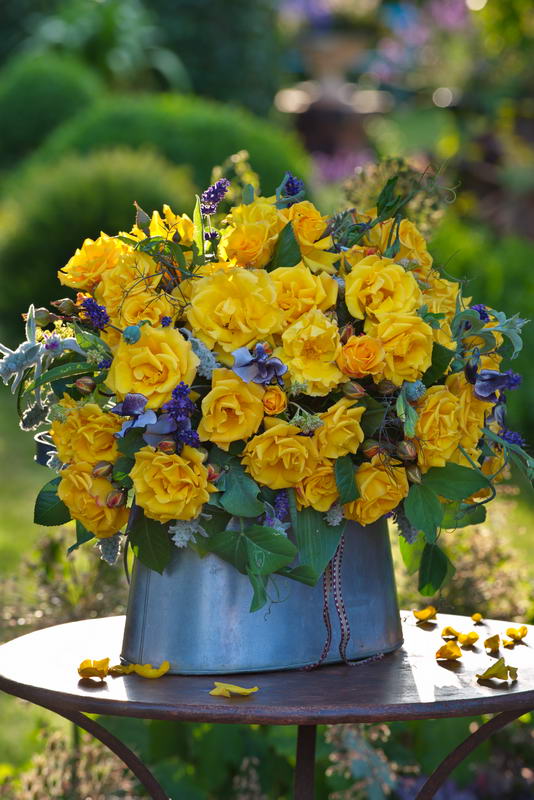 - Gelber Strauß aus Rosen in einer Vase aus Zinkeblech