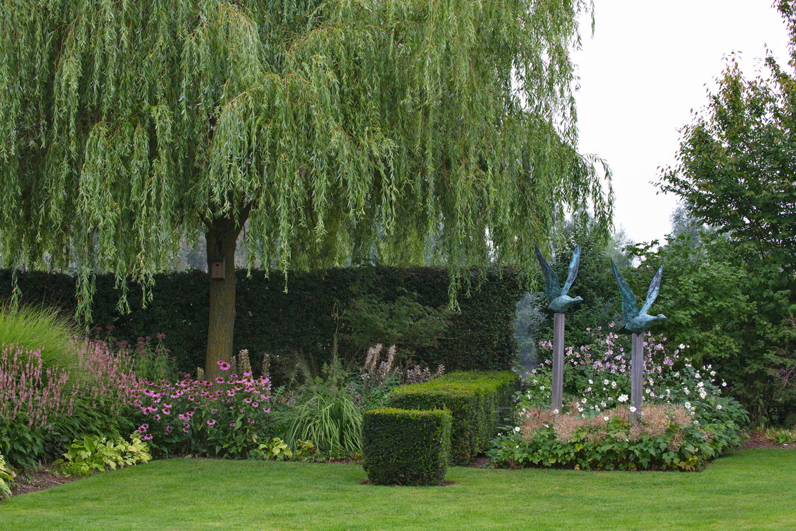 Hecke, Trauerweide, Echinacea, Herbstanemone