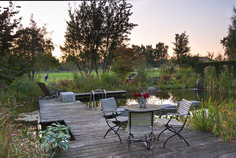 - Garten Scheele, Schwimmteich, Sitzplatz, Steg, Stuhl, Teich, Tisch