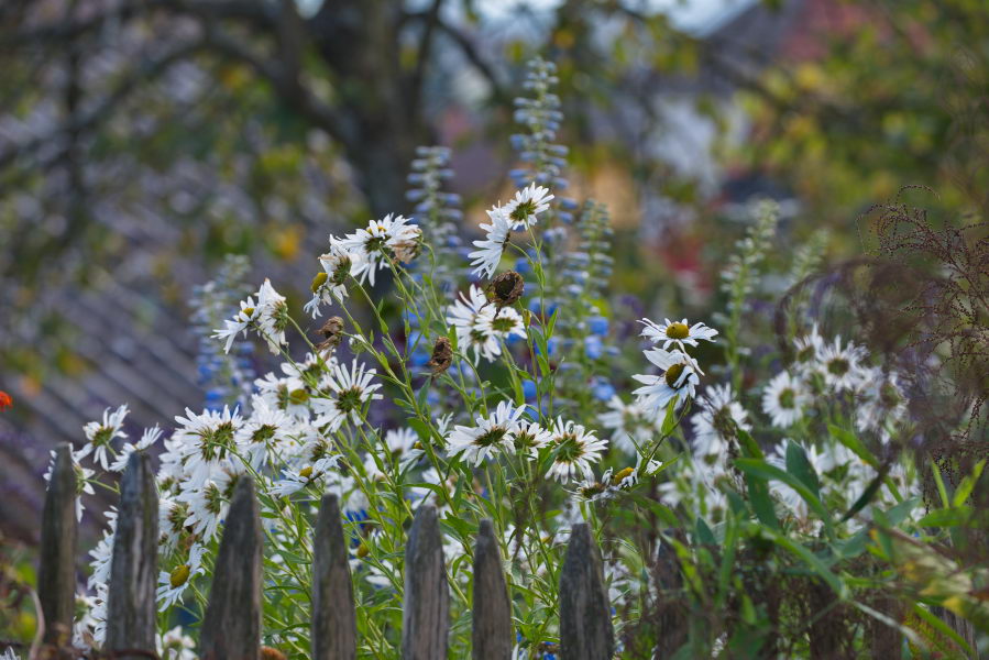 - Bauerngarten, Leucanthemella serotina, Oktobermargerite, Staketenzaun, Die Staudengärtnerei