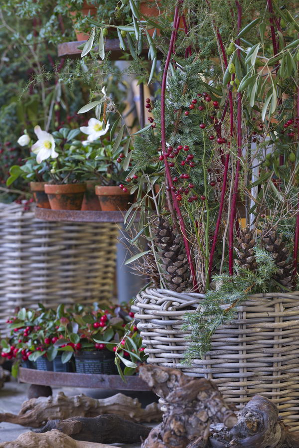 - Advent, Deko, Flechtwerk, Helleborus, Kornblumen, Tannenzapfen