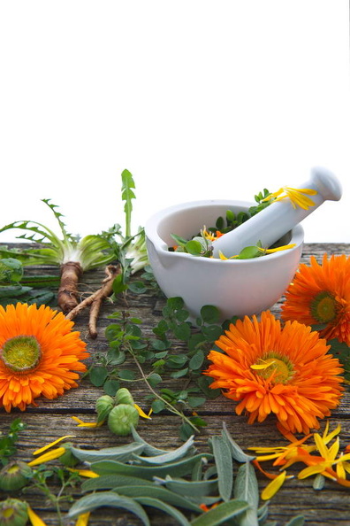 - Calendula, Kräuter, Löwenzahn, Mörser, Oregano, Ringelblume, Stellaria media, Taraxacum, Vogelmiere