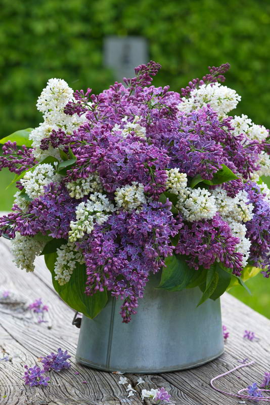 - Strauß mit weißem und rotem Flieder in einem Zinkeimer